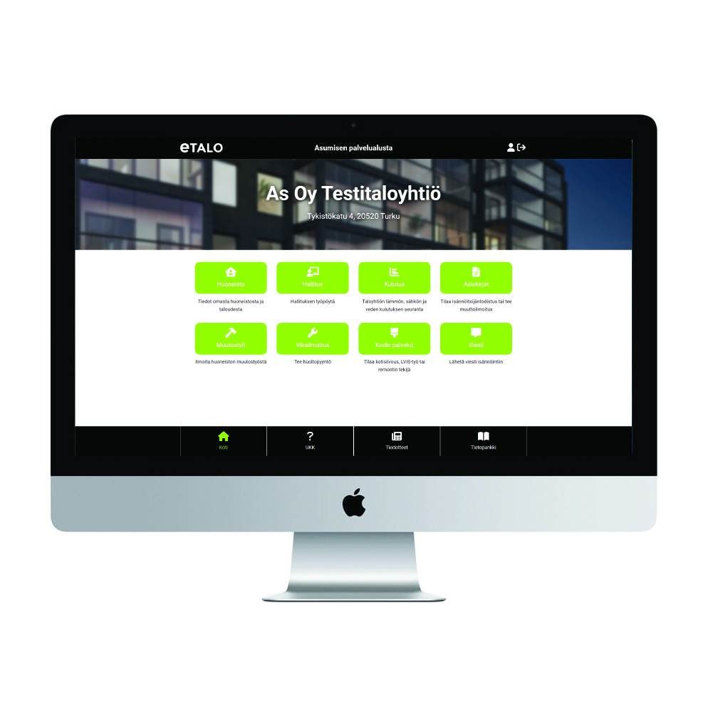 Tarjoamme taloyhtiönne käyttöön toimialan parhaat sähköiset työkalut sisältäen taloyhtiön oman verkkopalvelun, hallituksen työpöydän ja kunnossapidon hallinnan kaikki kuukausihintaan sisältyen. Taloyhtiölle räätälöity eTalon oma verkkopalvelu tekee asukkaiden asumisesta helppoa ja hallituksen työskentelystä tehokasta. Aivan kuten isännöinti, se kokoaa yhteen kaikki asumiseen tarvittavat tiedot ja palvelut. Tarvittava tieto on löydettävissä aina ja viestintä on nopeaa ja edullista.
